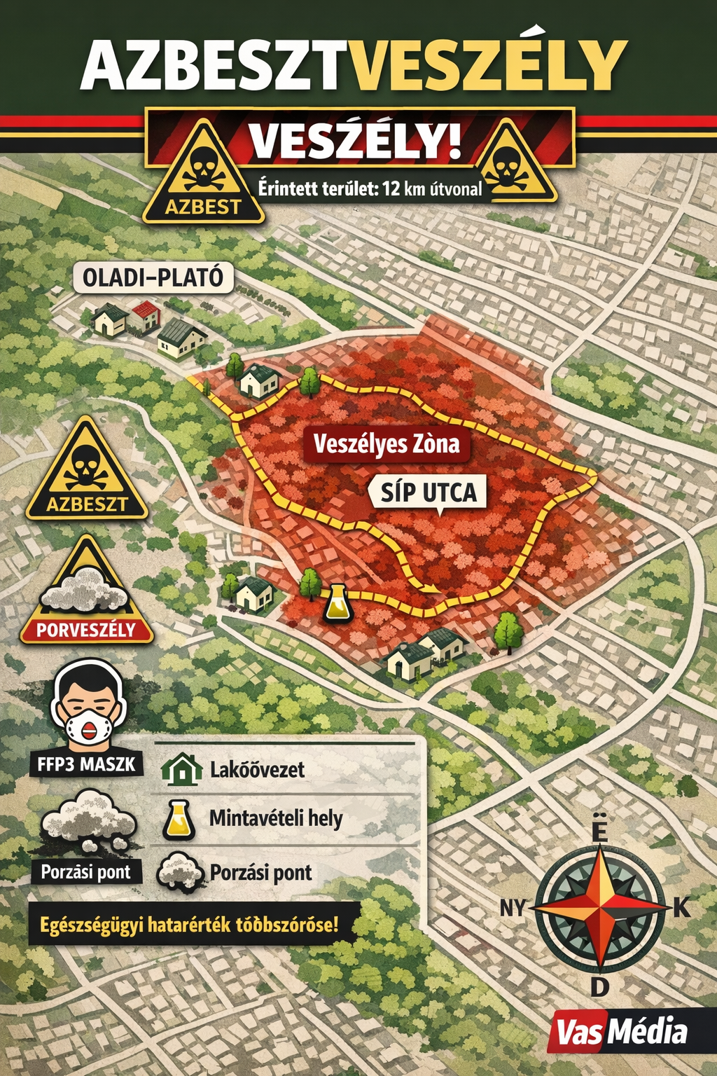 Szombathely történetének egyik legsúlyosabb környezet‑egészségügyi ügye robbant ki április közepén, miután kiderült: az Oladi‑plató útalapjába azbesztet tartalmazó osztrák kőzúzalék került. A hatósági vizsgálatok szerint a szennyezés többszörösen meghaladja az egészségügyi határértéket, a város pedig egészségügyi veszélyhelyzet elrendelését kérte a kormánytól.